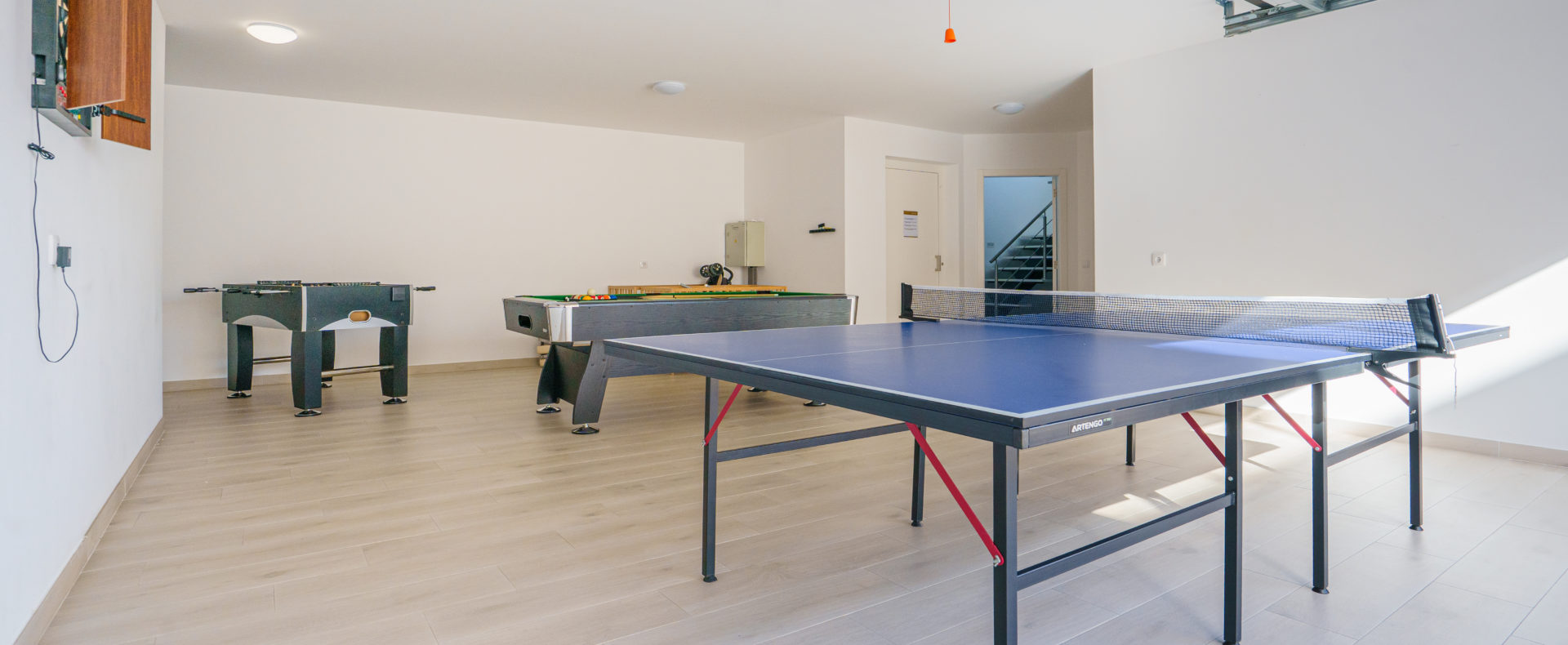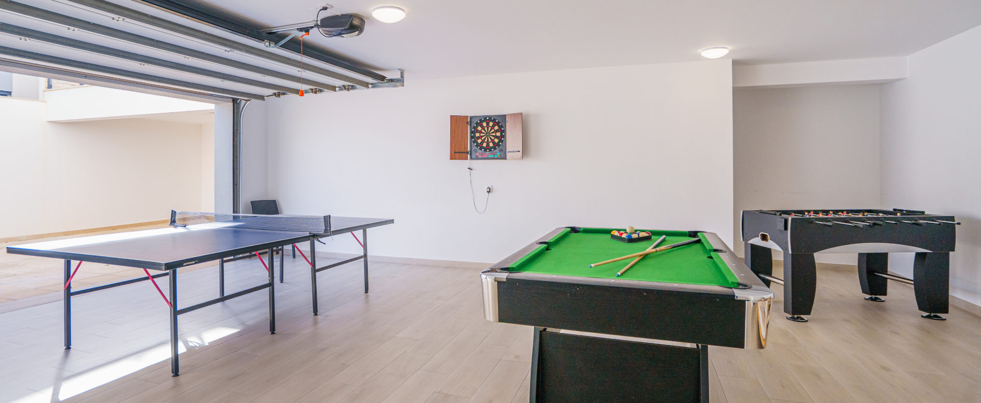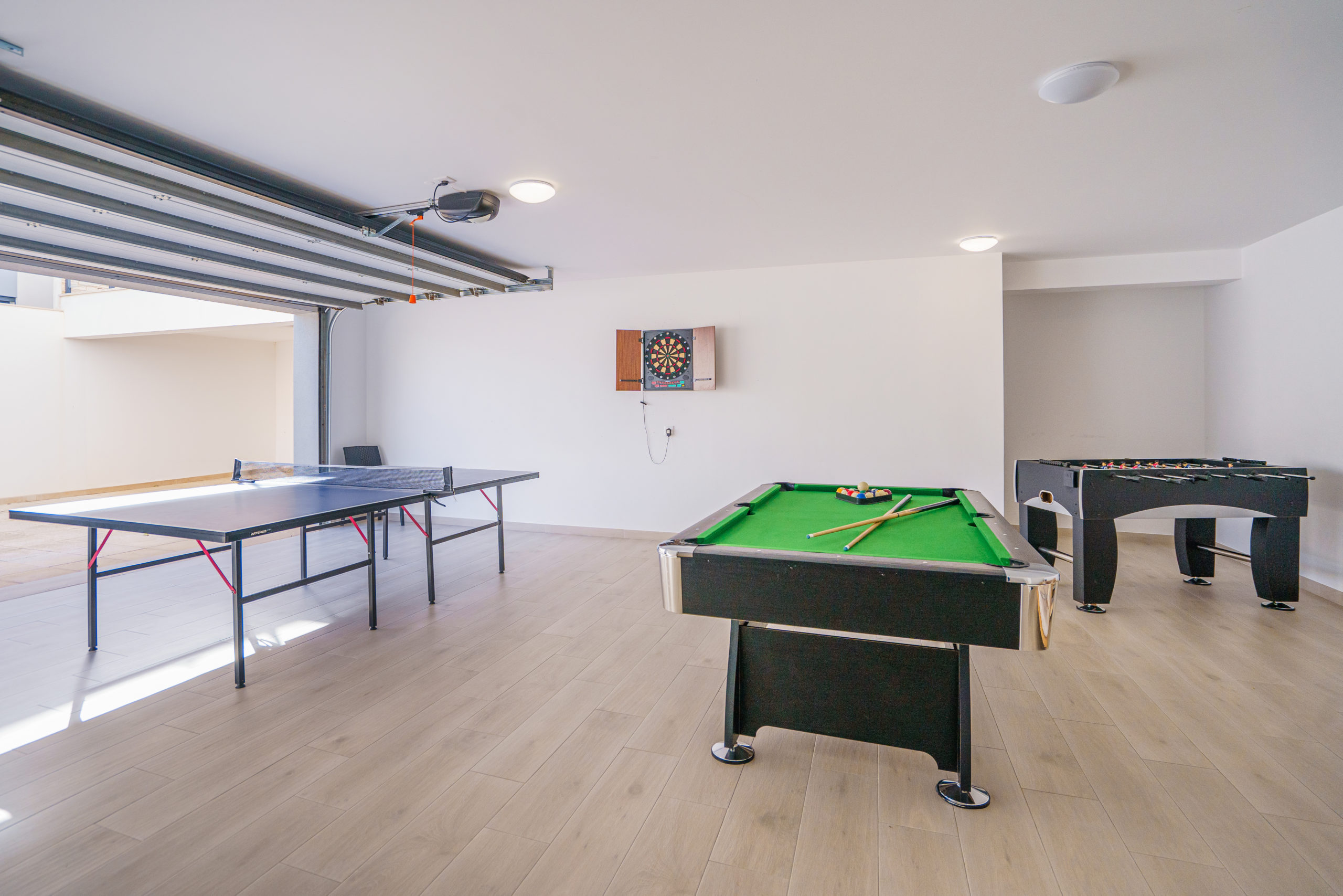 The games room is equipped with a pool table, table football, a ping-pong table and a set of arrows. And don’t forget the laundry room with dryer and washing machine.