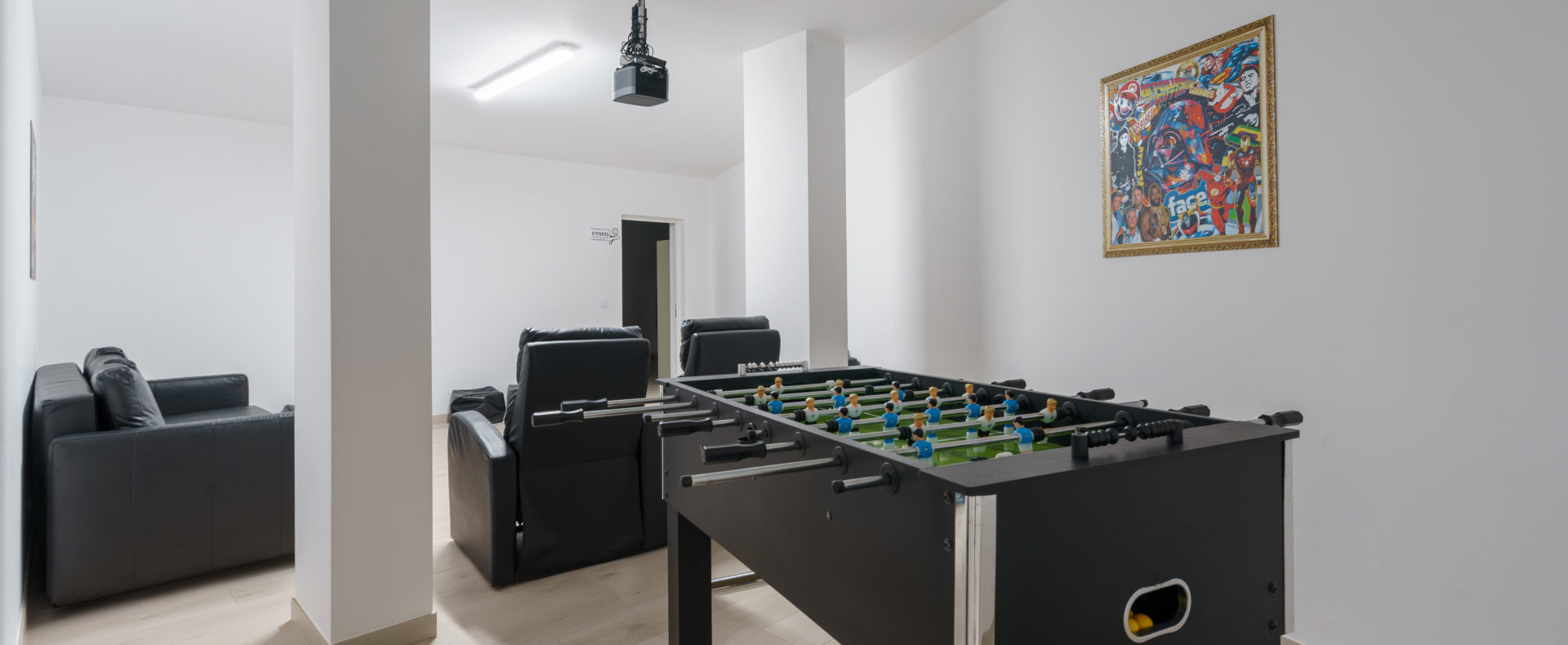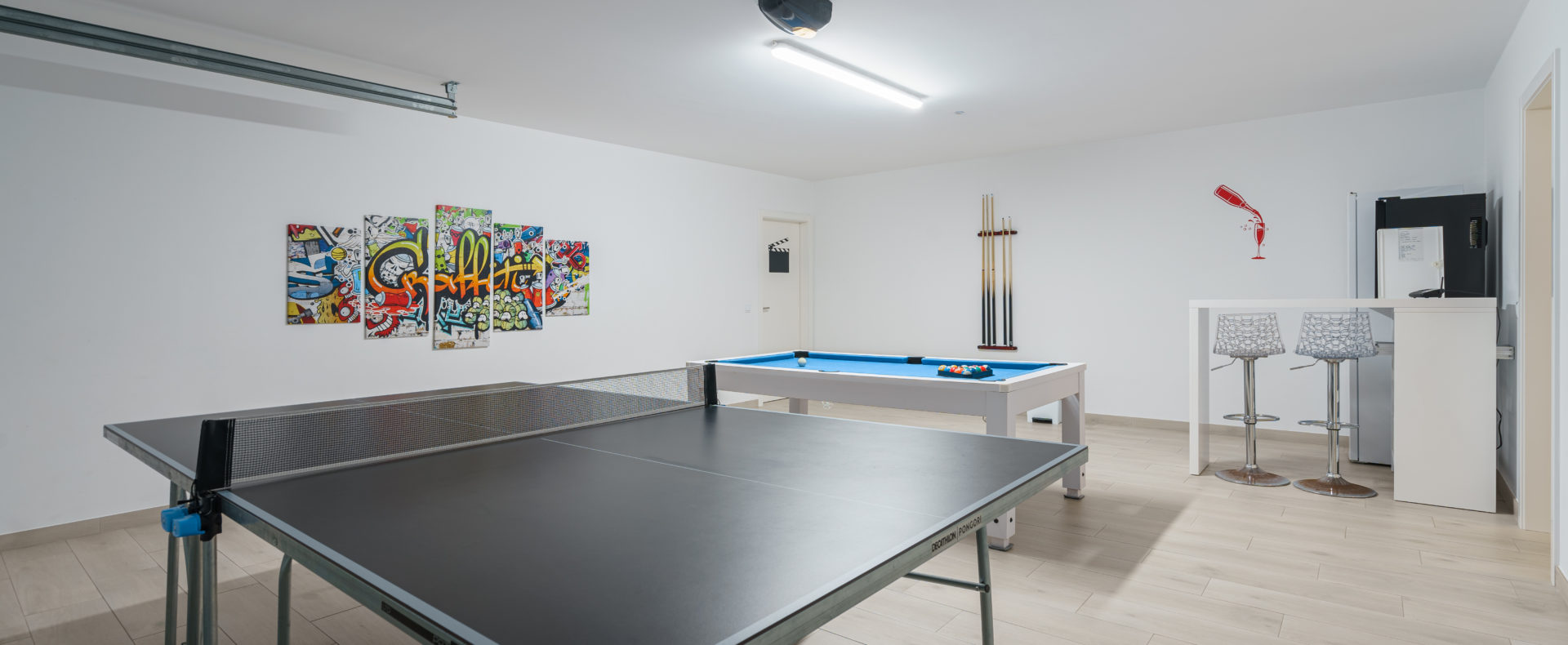 The games room is equipped with a pool table, table football and a table tennis table. And don’t forget the laundry room, with tumble dryer and washing machine, and gym.